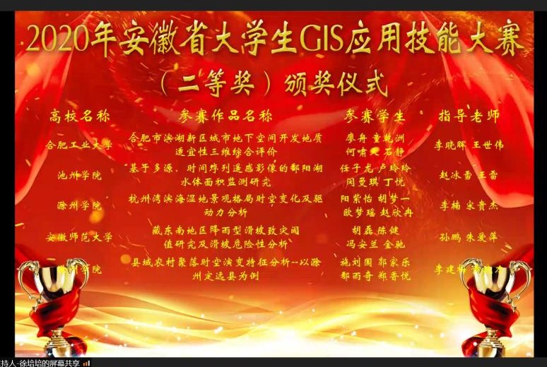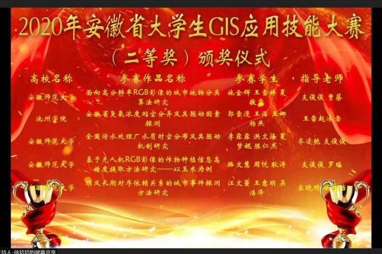 由安徽省教育厅主办,安徽师范大学承办的2020年安徽省老员工GIS应用技能大赛于11月8日完成决赛。比赛经过9月初的报名,10月20日的作品提交,10月31日的决赛名单公布到11月8日的线上答辩,历时两个多月的时间。受疫情的影响,今年比赛仅有“论文展示组”。