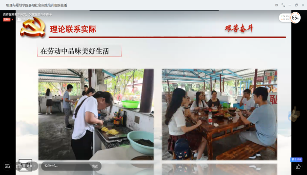 为了让同学们更好的体会实践出真知的道理,志愿者介绍了实践团师生采取“云组队”“云调研”“云访谈”等网络形式,通过理论学习与实践教育、线上与线下教育相结合的形式开展社会实践,并详细介绍了实践团队在暑假期间的活动历程:(1)团队在池州杏花村街道池口社区对留守儿童开展“童心飞扬·梦想启航”爱心暑托班活动,被安徽网、省教育厅网、今日头条、池州人网等多家媒体报道,贵池新闻对活动进行专门采访报道视频;(2)团队赴贵池区福利院“播洒爱心”在行动,慰问孤儿院的小朋友,与孤儿院的老员工结对友谊,被老员工网报、池州人网等多家媒体报道;(3)团队赴池州市红村爱国主义教育基地开展红色教育实践活动,志愿者展示了团队在红村跟随讲解员参观毛主席像章博物馆、烈士英雄墙的照片,并播放了团队成员在红村体验大锅台动手生火做饭的视频,这些令员工们感触特别深,深刻感悟劳动最光荣、劳动最崇高、劳动最伟大、劳动最美丽。