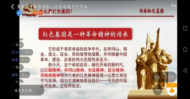 张沪荣同学为大家介绍了以红船精神、井冈山精神、长征精神、延安精神、西柏坡精神等为代表的红色精神,并为大家讲述了许多红色历史故事。随后,张沪荣和团队志愿者共同带领培训班学员学习习近平总书记的系列讲话精神。“我们要沿着革命前辈的足迹继续前进,把红色江山世世代代传下去”。
