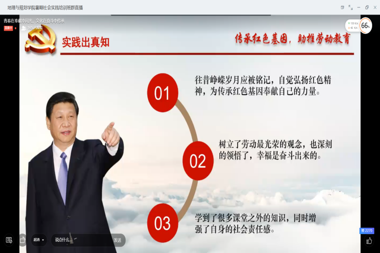 通过此次线上宣讲活动,让更多的池院学子认识到传承红色基因的重要意义,从革命先辈身上学习到的精神也让同学们领悟到当代青年应该用辛勤劳动去接好新时代赋予我们的接力棒,为中华民族伟大复兴的中国梦贡献自己的青春力量!