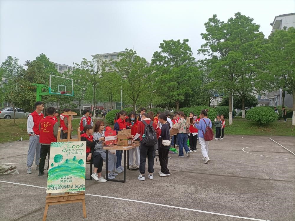 在活动中,志愿者们在篮球场集中收集同学们废弃的塑料瓶、纸盒,向师生传达环保理念。