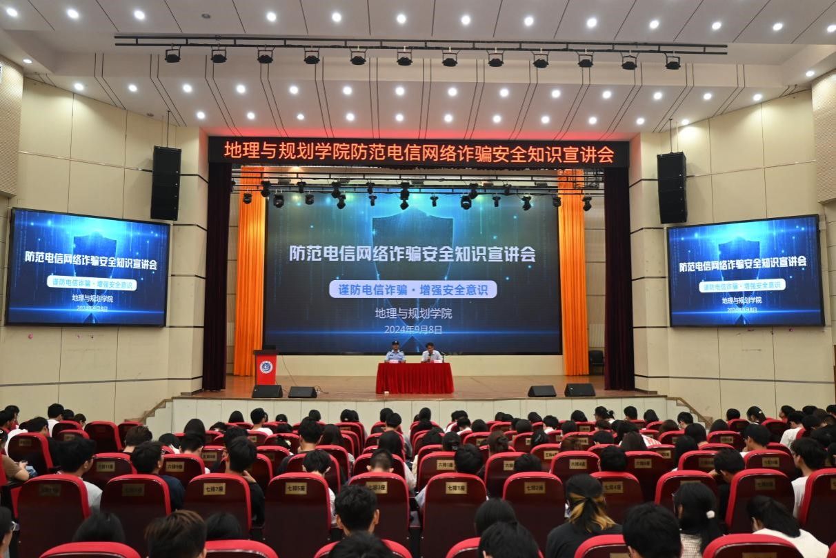 9月8日,威廉希尔体育在博古楼礼堂召开了防范电信网络诈骗安全知识宣讲会。池州市公安局贵池分局马衙派出所驻校民警陶德兵以“谨防电信诈骗 增强安全意识”为题作宣讲报告,会议由地理与规划公司党委副书记何小青主持。