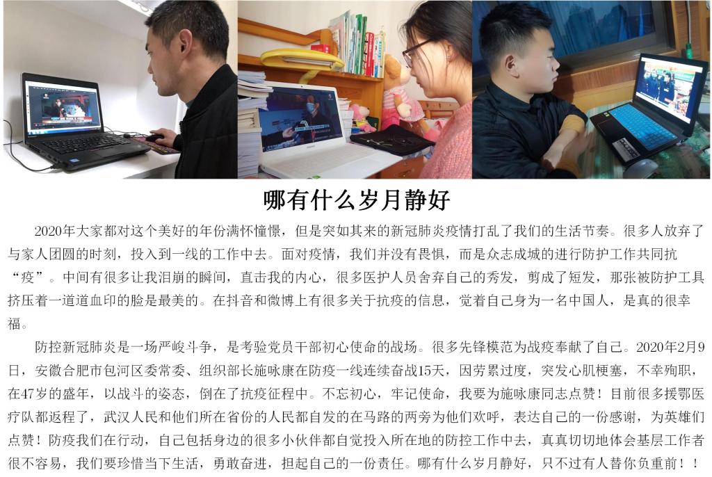 此次党日活动将全院师生党员凝聚在一起汇聚力量,传递温度。没有一个冬天无法逾越,没有一个春天不会来临,春暖花开终有时,繁花似锦将来到。愿疫情早日散去,祖国无恙、你我无恙、武汉加油!中国加油!