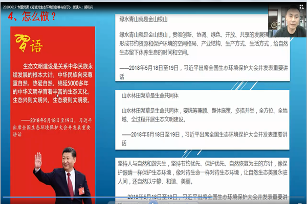 6月17日下午,公司党委委员、副经理胡和兵以《疫情对生态环境的影响与启示》为题,为威廉希尔体育员工一支部全体师生党员讲授线上疫情防控专题党课。