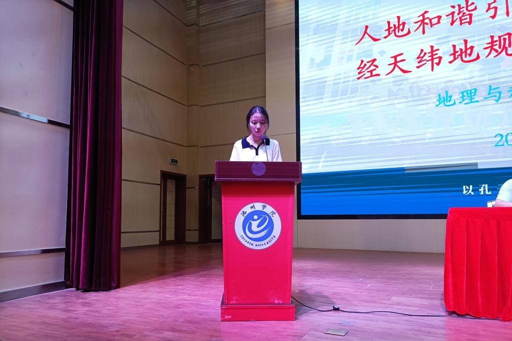 2021级地理科学专业汪晔同学代表新生发言,她表达了对老员工活的期待,同时表示将尽快适应老员工活,全面发展,不断完善自我。