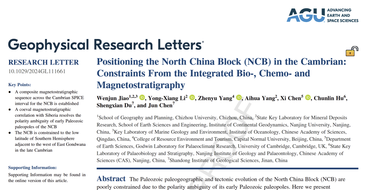近日,国际地学顶级刊物Geophysical Research Letters(自然指数Nature Index期刊,中科院1区TOP)在线刊发了公司威廉希尔体育焦文军博士在华北板块寒武纪古地理研究上的重要研究成果。Geophysical Research Letters是美国地球物理学会(AGU)旗舰刊物,在地学界具有重要影响力,被收录为自然指数期刊。自然指数(Nature Index)期刊是自然出版集团编制的全球顶级的研究型学术期刊,用于衡量机构、国家和地区在自然科学领域的高质量研究产出情况,在全球范围内具有很大影响力。