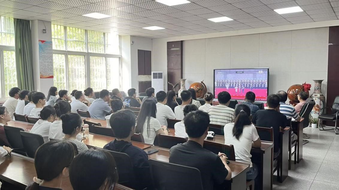 观看直播过程中,在场师生神情专注,认真聆听习近平总书记在大会上发表的重要讲话,共同回顾中国人民抗日战争的峥嵘岁月,深刻感受到革命先烈们不屈不挠、英勇抗战的伟大精神。师生在观看盛大阅兵式时,无不被整齐划一的徒步方队、气势磅礴的装备方队以及英姿飒爽的空中梯队所深深震撼,更感受到今日的和平幸福生活来之不易。尤其是看到军事航天部队、网络空间部队、信息支援部队等首次亮相的新型作战力量方队时,备感自豪,愈发认识到科技强军、科技强国的重要性。